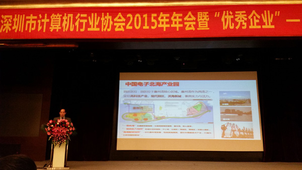 2016年1月7日,深圳市計算機行業(yè)協(xié)會2015年年會隆重舉行,受協(xié)會之邀,中國電子科技開發(fā)有限公司總經(jīng)理、北海市電子信息行業(yè)協(xié)會會長賀海華率中電科技旗下北海、西安、溫州園區(qū)參加盛會,賀海華與會員單位分享交流了中電科技建設產(chǎn)業(yè)園區(qū)板塊經(jīng)驗,介紹推介了各地方園區(qū)產(chǎn)業(yè)特點,衷心希望與各會員企業(yè)開展產(chǎn)業(yè)合作,歡迎來園區(qū)調(diào)研、拓展業(yè)務,賀海華的精彩講解得到了參會嘉賓們的高度認同與熱烈回應。盛會間隙,北海、溫州、西安園區(qū)相關(guān)負責人和意向投資企業(yè)進行了暢談,現(xiàn)場氣氛活躍,很多企業(yè)對中國電子投資建園的地區(qū)表達了合作意向,愿意進一步加強了解與合作,其中,北海以獨特的區(qū)位優(yōu)勢、產(chǎn)業(yè)政策、生態(tài)優(yōu)勢,備受多家深圳企業(yè)重點關(guān)注。